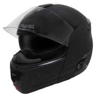 Hawk H-6611 Flat Black Dual-Visor Modular Motorcycle Helmet with Blinc Bluetooth Sz M Item Details ABS Thermoplastic shell One button, one-hand flip-up sytem converts helmet from full-face to open-face Glove-friendly and waterproof controls Quick-release, anti-scratch visor Interior retractable drop-down smoke tint sun-visor ( drop-down button located on left side of helmet) Flow-through ventilation system Inner lining: removable and washable Chin strap with quick-release closure and strap keeper. DOT-approved (non-removable graphics on the back) Hawk graphics on the front and back Blinc Bluetooth® Integrated Communication technology: Cell phone compatible (Iphone compatible) Compatible with many GPS units Interference free communications Lithium-Ion replaceable battery Battery life: 4 hours continuous talk time and 100 hours standby Complete recharge of battery - 6 hours Noise cancelling mic Full duplex communications with DSP filter Self adjusting volume Waterproof controls 30 feet of intercom and communications distance Music streaming Glove friendly controls Multifunction LED indicators 110V/220V charger Blinc Bluetooth Module System: Talk rider to passenger (Intercom) Talk bike to bike (2-way communications) Use your cellphone Listen to streaming music from MP3 and phone Listen to GPS directions One-touch cell phone/intercom override Automatic phone/mp3 override Listen to XM radio through phone