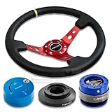 NRG-SRK-E46H+200BL+101NB+006RDY, NRG Innovations 13.78" 350mm 3" Deep Dish Style Black Leather Yellow Center Marking Red Spokes Racing Steering Wheel Combo with 6 Hole Short Hub Adapter with Gen 2.0 New Blue Quick Release with New Blue Lock Hub Kit SRK-E46H